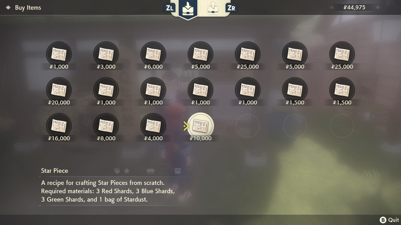To be able to use colored shards to craft these Star Pieces, first you’ll need to get 10,000 Pokedollars to afford the recipe. This isn’t much considering you can make your money back with just 2 Star Pieces. Go to the Craftworks shop in Jubilife Village and speak to Anvin. Here ask for recipes and it should be the last one on the list. Buy this recipe to unlock the ability to craft expensive Star Pieces. To craft a Star Piece you’ll need 2 red shards, 2 green shards, 2 blue shards, and 1 star dust.