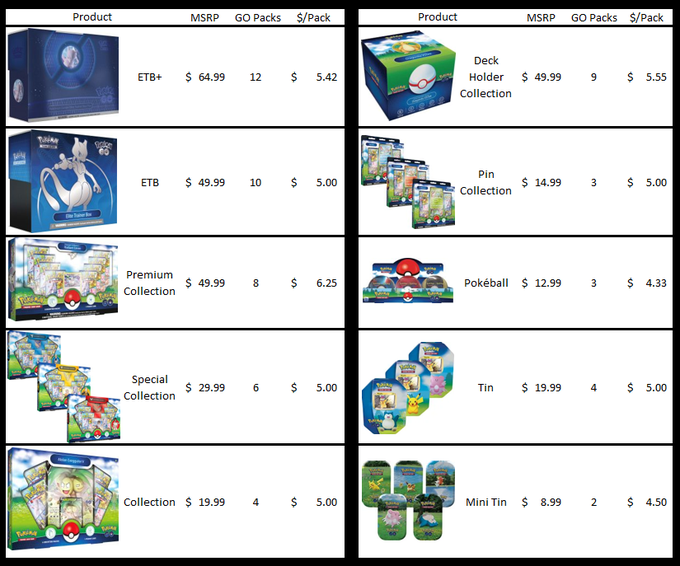 You can’t buy Pokemon GO packs individually from retail stores, so you’ll have to buy a collection box or tin. This makes these packs a little more expensive. But which box or tin is more worth it? This chart shows all of the Pokemon GO card products and they’re pricing. The best price per pack value is in the Pokeballs for $4.33 or Mini Tins for $4.50. Normally Pokemon booster packs cost about $3.99, so these prices aren’t too expensive.